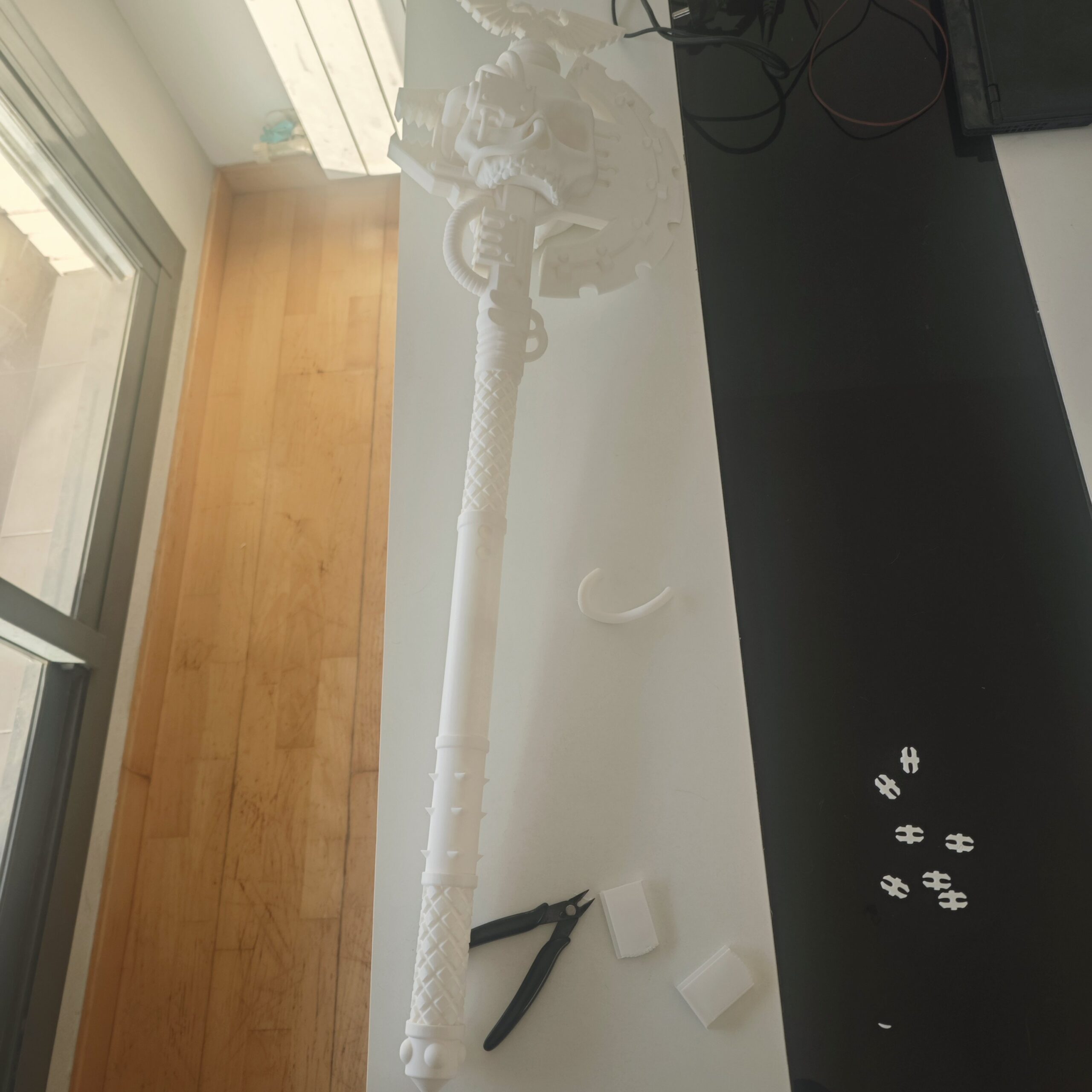 Hacha Omnissiana 1:1 para cosplay, inspirada en el Adeptus Mechanicus. Impresa en 3D con gran detalle. Opciones: kit, montada o pintada. Envío rápido desde España. Forjado en Plástico.